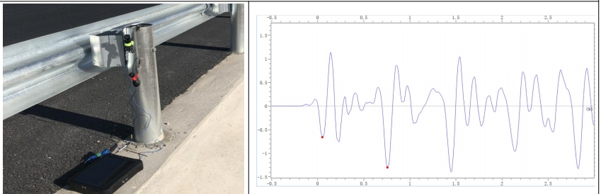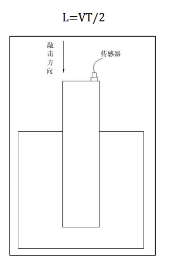 通过弹性波在立柱内的传播时间T及立柱的固有波速V可检测护栏立柱总长度L,通过外露长度可确定立柱埋深。