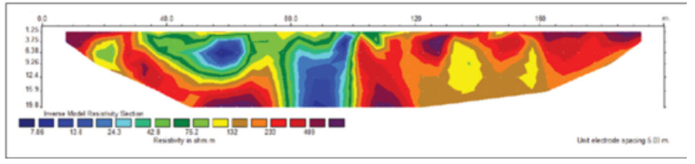 图 3:沿坝顶的高密度电阻率成像(ERT)剖面图,清晰显示出含水量升高区域(蓝色区域)。