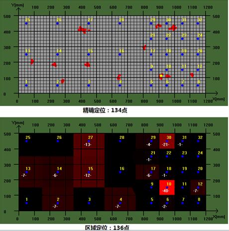 7、区域定位:对于形状不规则质地不太均匀的物体,软件可实现区域定位,并在图中显示每区域声发射损伤点的数量,数量越大颜色也不同,从而可以看出什么区域损伤更为严重。
